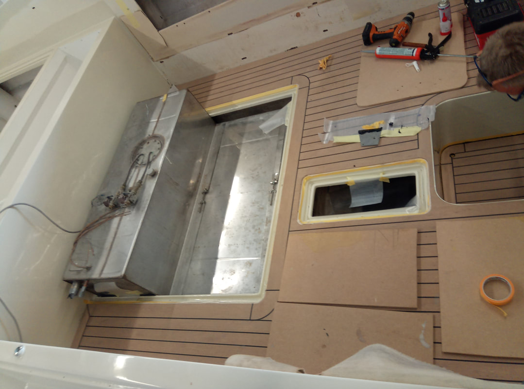 - Volledig schuren en renoveren van het teakdek en potdeksel.